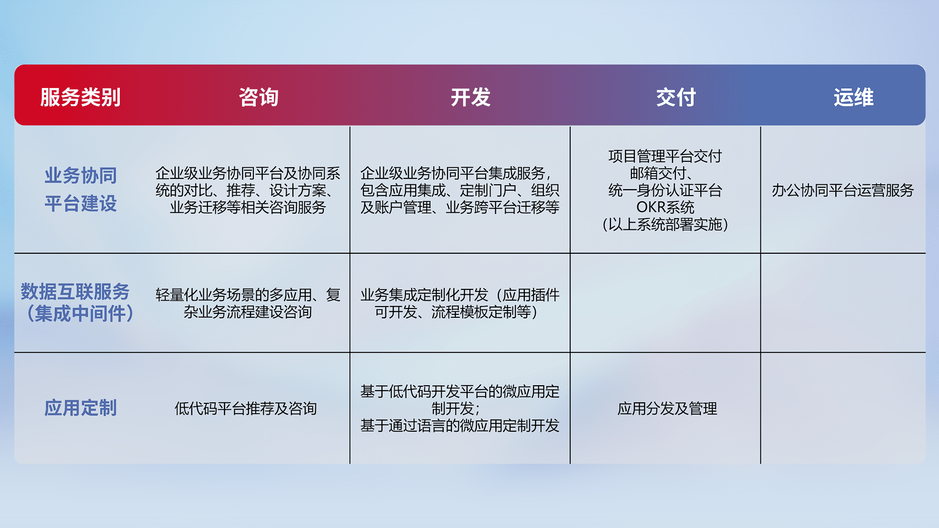 针对钉钉、、、、企微、、IDaas等平台级产品提供产品的规划、、方案、、交付、、、定制化开发等服务,,,实现如统一协同办公、、智能客户服务、、、混合会议管理、、、智能数据查询、、等业务场景,,,,实现数字化转型。。。