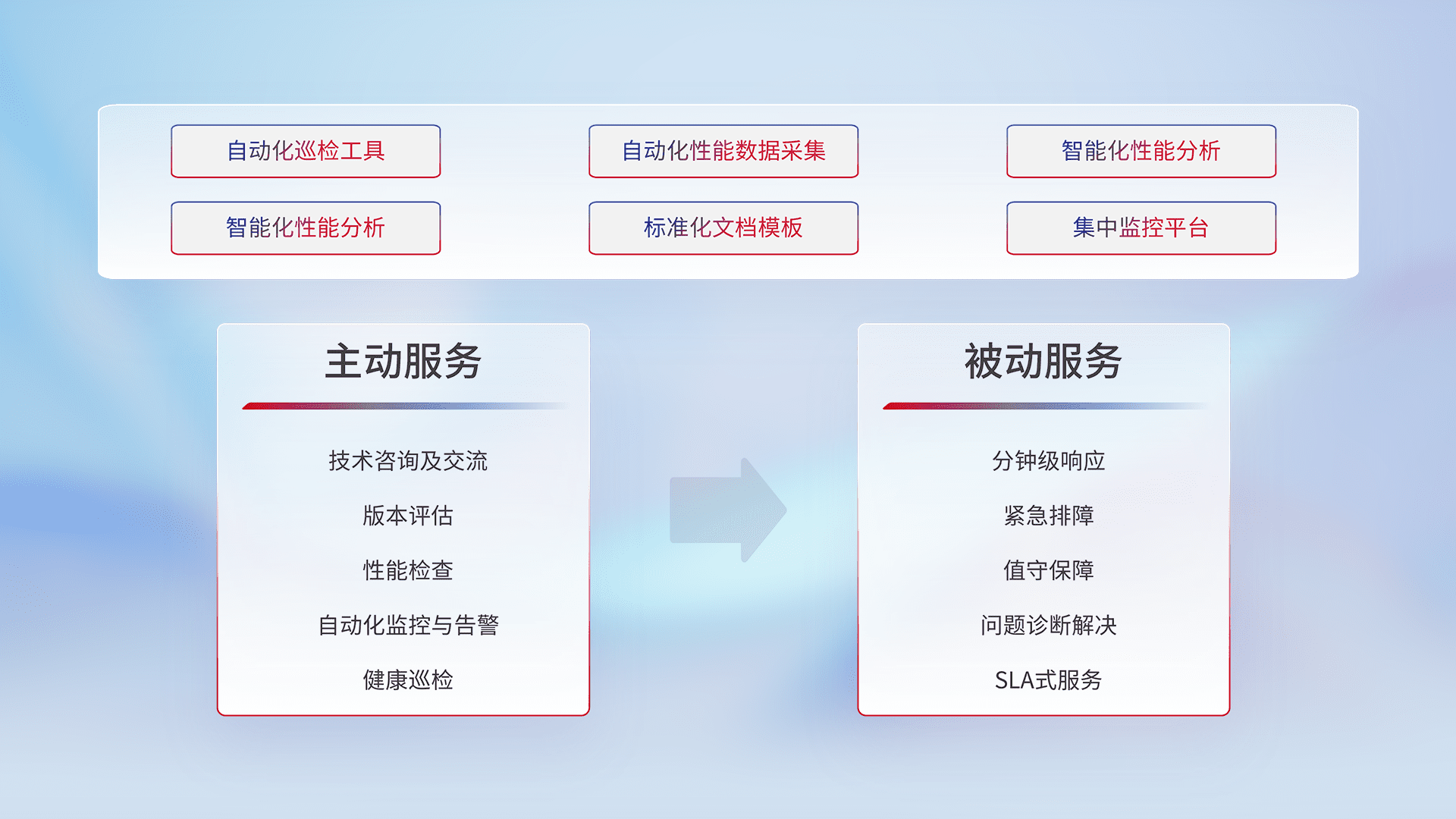 智能化工具和标准化文档,,,保障服务质量,,,,提供主动服务(包含技术咨询、、、版本评估、、、性能检查、、、、自动化监控与告警、、、、健康巡检)和被动服务包含(分钟级响应、、紧急排障、、、、值守保障、、、、问题诊断解决、、、SLA服务)。。